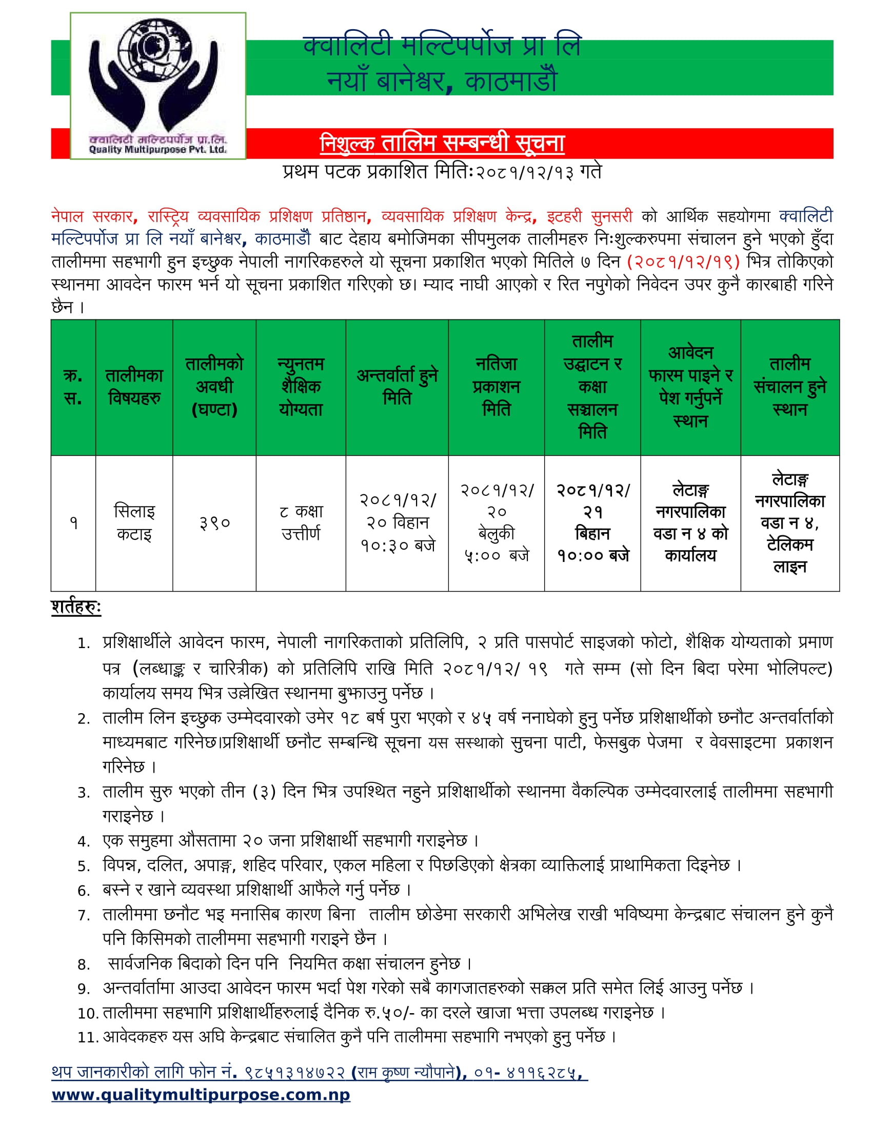 नेपाल सरकार, रास्ट्रिय व्यवसायिक प्रशिक्षण प्रतिष्ठान, व्यवसायिक प्रशिक्षण केन्द्र, इटहरी सुनसरी को आर्थिक सहयोगमा क्वालिटी मल्टिपर्पोज प्रा लि नयाँ बानेश्वर, काठमाडौँ बाट देहाय बमोजिमका सीपमुलक तालीमहरु निःशुल्करुपमा संचालन हुने भएको हुँदा तालीममा सहभागी हुन इच्छुक नेपाली नागरिकहरुले यो सूचना प्रकाशित भएको मितिले ७ दिन (२०८१/१२/१९) भित्र तोकिएको स्थानमा आवदेन फारम भर्न यो सूचना प्रकाशित गरिएको छ। म्याद नाघी आएको र रित नपुगेको निवेदन उपर कुनै कारबाही गरिने छैन ।